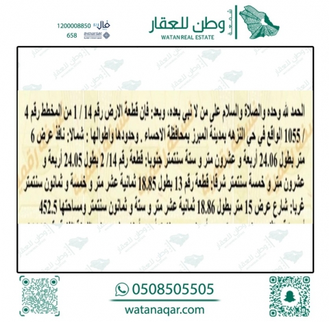 المساحة 452.5م شارع عرض 15 * 6 الإتجاه: شمال غرب السعر: 800,000 ريال ملاحظات ملاحظة: السعر غير شامل الضريبة والسعي رخصة فال 1200008850 - المشاهدات: 42