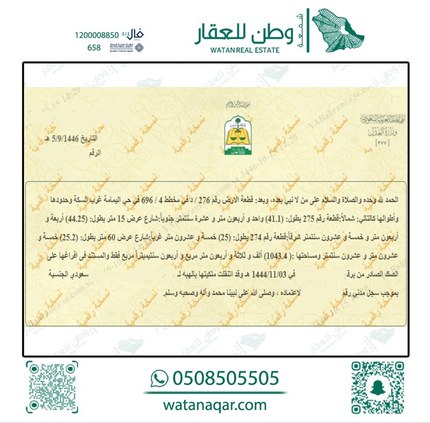 المساحة 1,043.4م شارع عرض 60 - 15 الإتجاه: جنوب * غرب على السوم ملاحظات ملاحظة: سوم المتر 4000 ريال غير شامل الضريبة والسعي رخصة فال 1200008850 - المشاهدات: 10