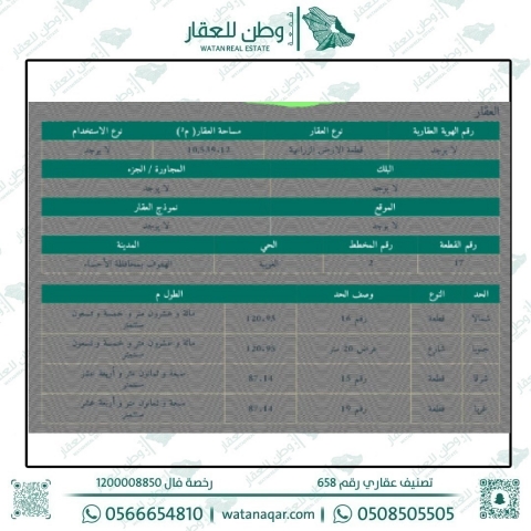 المساحة 10,539م شارع عرض 20 الإتجاه: جنوب الأطوال: - سعر المتر: 230 ريال ملاحظات ملاحظة: * السعر غير شامل الضريبة والسعي رخصة فال 1200008850 - المشاهدات: 162