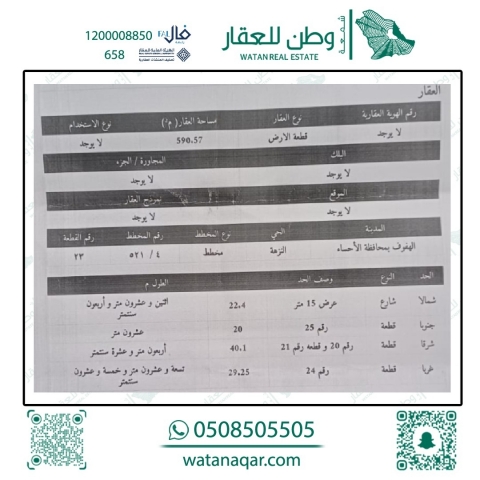 المساحة 590.6م شارع عرض 15 الإتجاه: شمال الأطوال: 22.4 × 20 × 40.1 × 29.25 على السوم ملاحظات ملاحظة: السعر غير شامل الضريبة والسعي رخصة فال 1200008850 - المشاهدات: 21